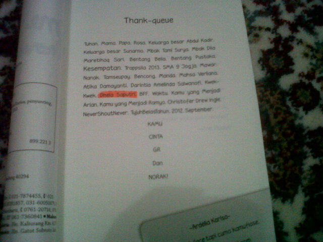 terimakasih liiii, tersanjung banget, seneng <3 terus gitu aku pamerin ke temen-temen aku dan mereka langsung bilang 'wow' for sure, tapi gak sambil koprol. jadi gak enak, nampang di thank-queue page, minta gratisan, dianterin ke rumah sampai sempet aku ketiduran, dan baru tau setelah cetakan kedua terbit :) sebagai teman merasa hina, ampun -_- terimakasih banyak banget pokoknya, belum tau mau bales pake apa <3 <3 <3